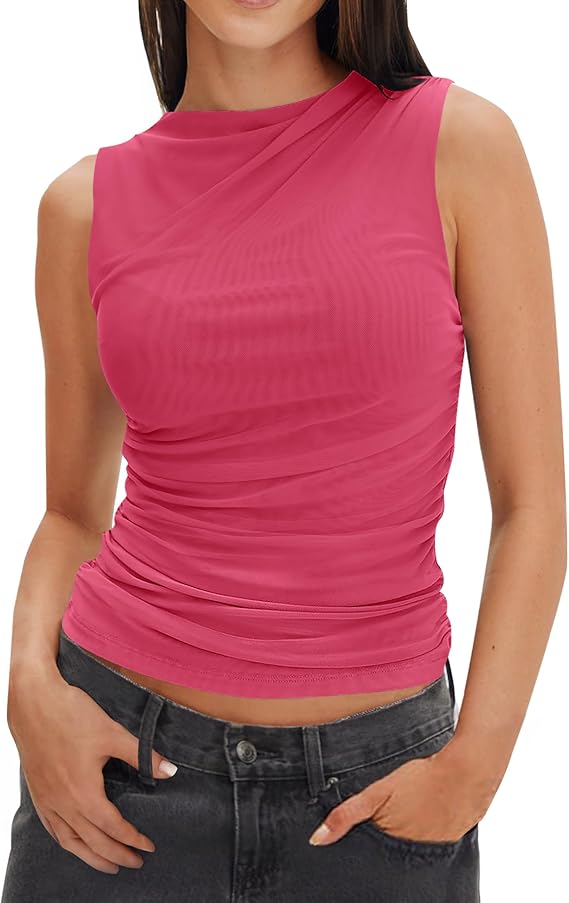 - Features: Sleeveless tops, Mesh, Ruched, high neck tank top, solid color, slim fit, trendy top, going out tops, sexy and casual tank top